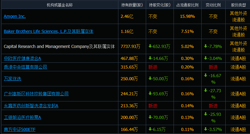 具體來看,中歐醫療健康混合A排位靠前,分別位列百濟神州、百利天恒前十大流通股東名單的第四位、第三位,分別持有467.88萬股、357.07萬股。
