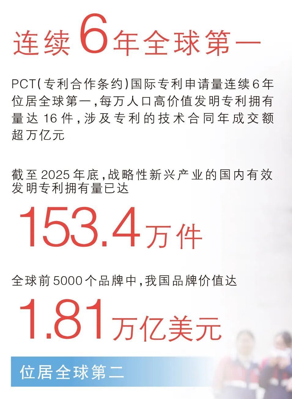 人工智能、量子科技、生物制造、腦機(jī)接口……截至2025年底,我國國內(nèi)高價值發(fā)明專利中,七成來自戰(zhàn)略性新興產(chǎn)業(yè)。保護(hù)知識產(chǎn)權(quán)就是保護(hù)創(chuàng)新。從人工智能服務(wù)千行百業(yè),到風(fēng)電技術(shù)推動綠色轉(zhuǎn)型發(fā)展,532萬件專利正成為連接創(chuàng)新與市場的紐帶,為加快發(fā)展新質(zhì)生產(chǎn)力注入澎湃動能。