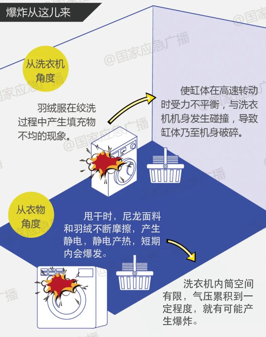 尼龍面料和羽絨經過不斷摩擦產生靜電后,靜電產熱短期內會爆發,再加上洗衣機內筒空間有限,氣壓累積到一定程度,就有可能產生爆炸。