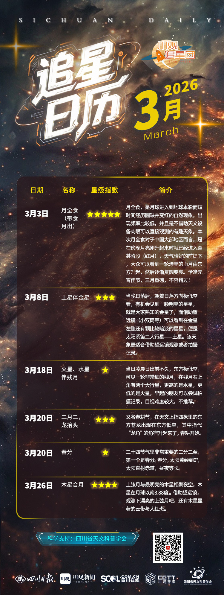 三月的夜空從不吝嗇浪漫,從元宵節(jié)月全食到行星相伴,從傳統(tǒng)星象到節(jié)氣更替,每一場天象都是宇宙寫給人間的情書。抬抬頭,即可遇見宇宙的溫柔與震撼。