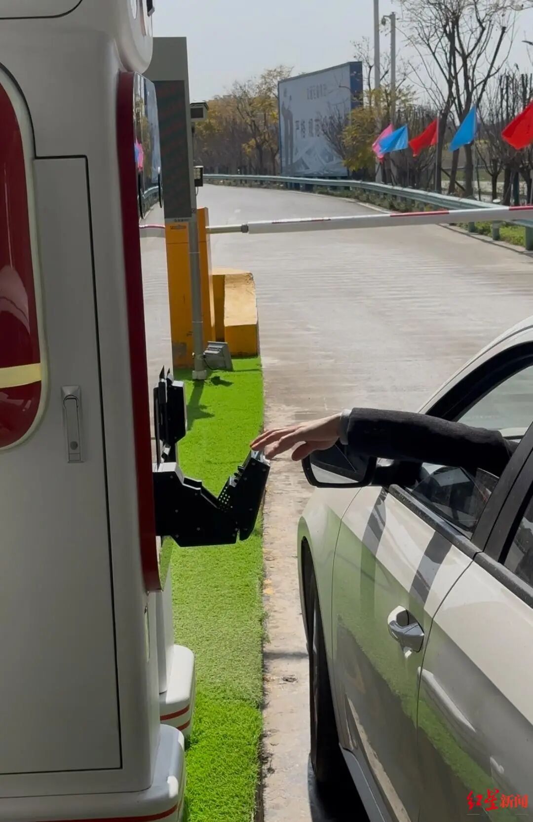 車輛開到人工通道時,卻發(fā)現(xiàn)并沒有收費(fèi)員,正當(dāng)他疑惑時,旁邊的智能機(jī)器人已經(jīng)遞出通行卡,他輕輕一抬手就拿到了。取卡后,通行桿抬起,幾秒鐘內(nèi),他便順利地駛?cè)敫咚佟?/p>