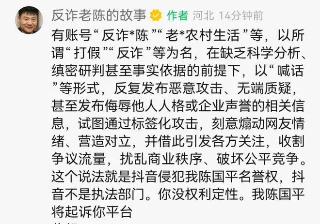 此前報道:反詐老陳賬號被罰,目前已搜索不到,官方:以打假反詐為名,刻意煽動網友情緒、營造對立
