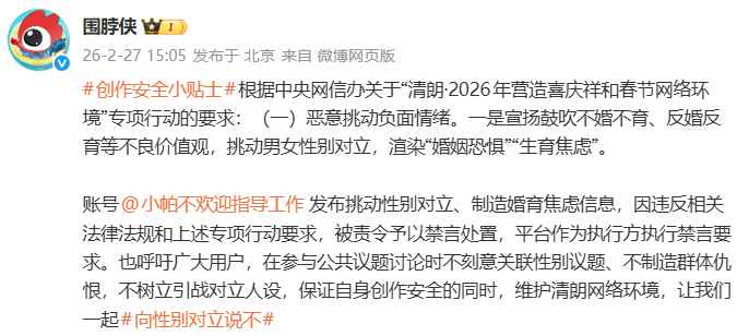 根據中央網信辦關于“清朗·2026年營造喜慶祥和春節網絡環境”專項行動的要求:(一)惡意挑動負面情緒。一是宣揚鼓吹不婚不育、反婚反育等不良價值觀,挑動男女性別對立,渲染“婚姻恐懼”“生育焦慮”。