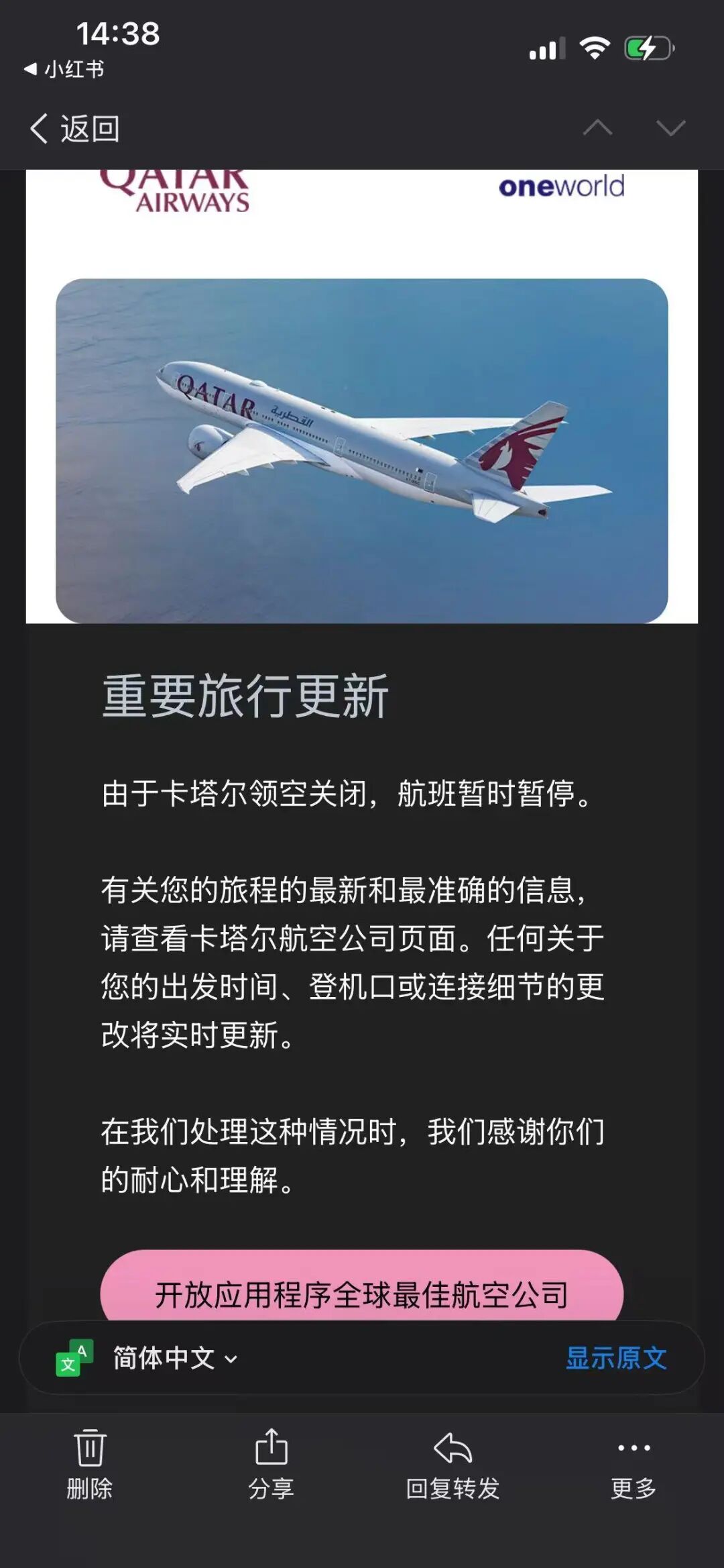 林越表示,卡塔爾航空關閉了所有進出多哈的航線。