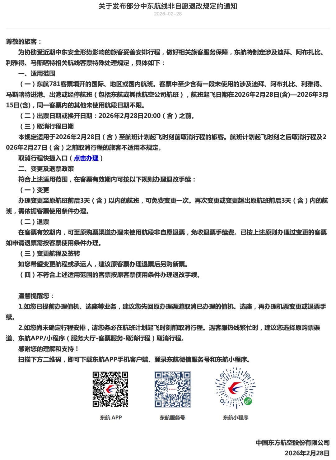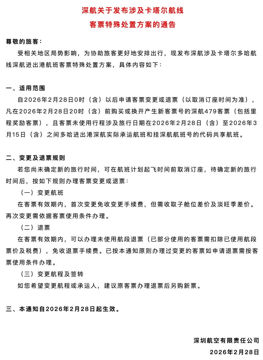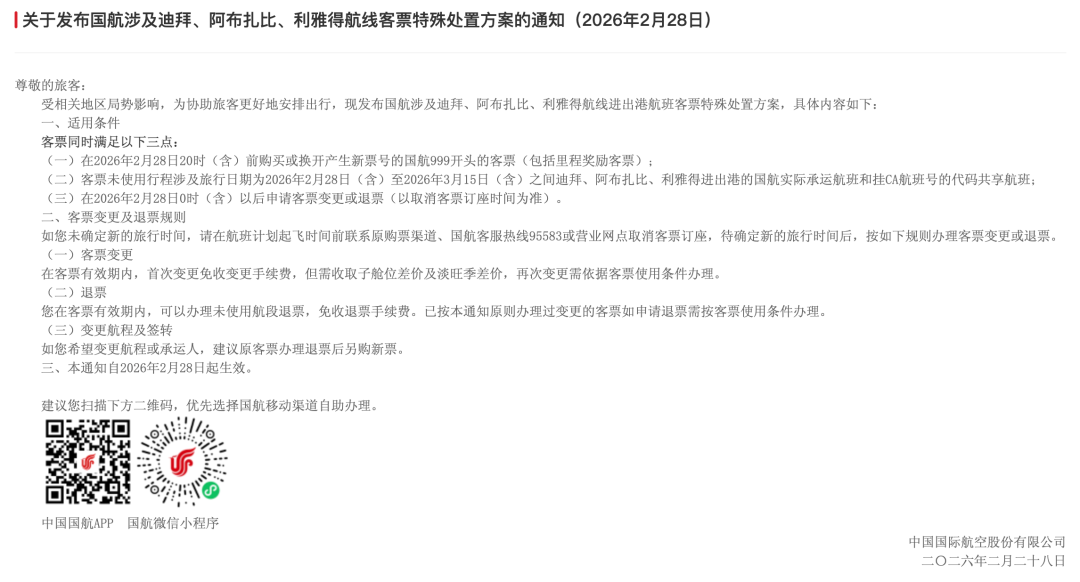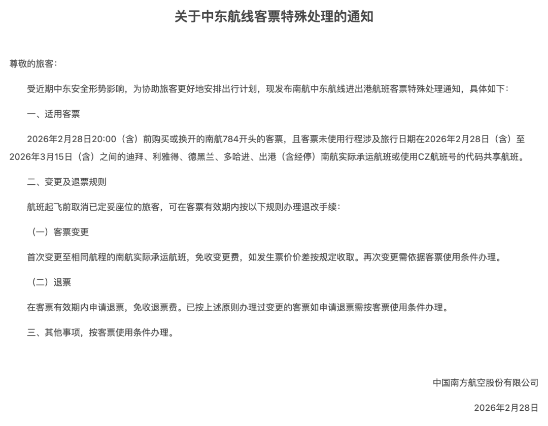 2月28日晚,國航、東航、南航、深航、海航、廈航等多家航司發(fā)布涉中東地區(qū)航班客票特殊處理方案:對于客票未使用行程涉及旅行日期為2026年2月28日(含)至2026年3月15日(含)之間,出票日期或換開日期在2026年2月28日20:00(含)之前,并符合條件的相關(guān)航線客票,在客票有效期內(nèi),可至原購票渠道辦理未使用航段非自愿退票,免收退票手續(xù)費。
