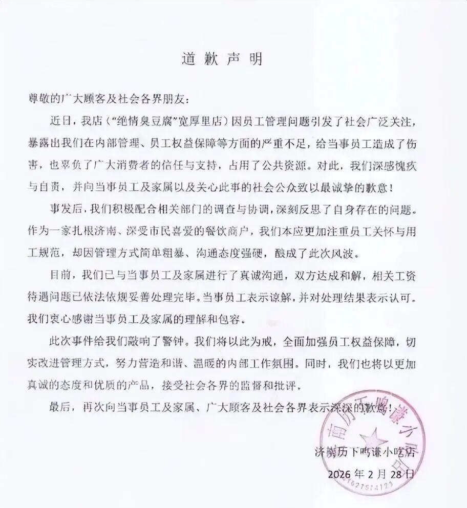 據媒體最新消息,山東濟南“絕情臭豆腐”員工維權事件于2月28日有了新進展。涉事商家“絕情臭豆腐”店公開發布道歉聲明,承認“在內部管理、員工權益保障等方面存在嚴重不足”,向當事員工及公眾道歉。