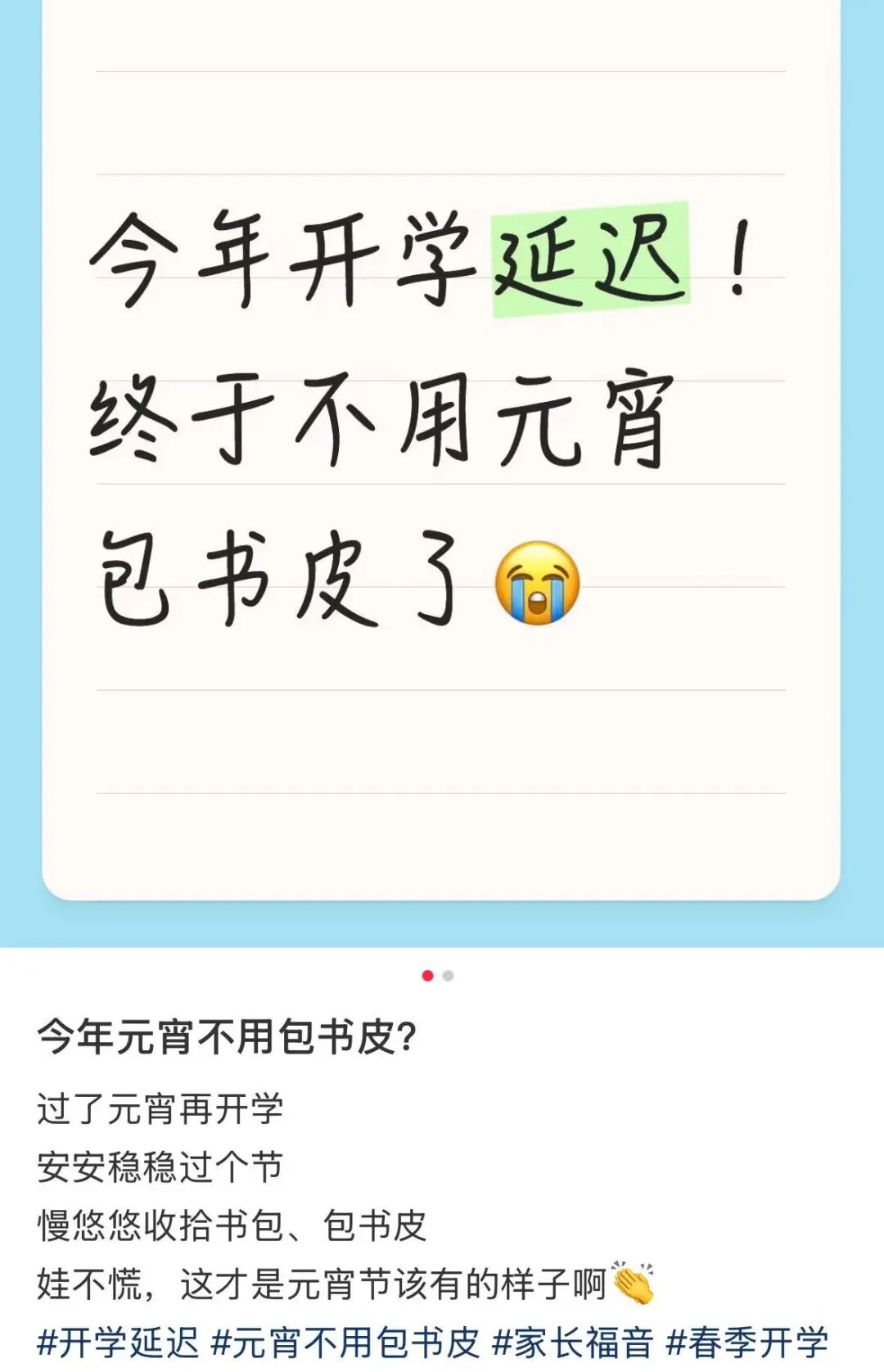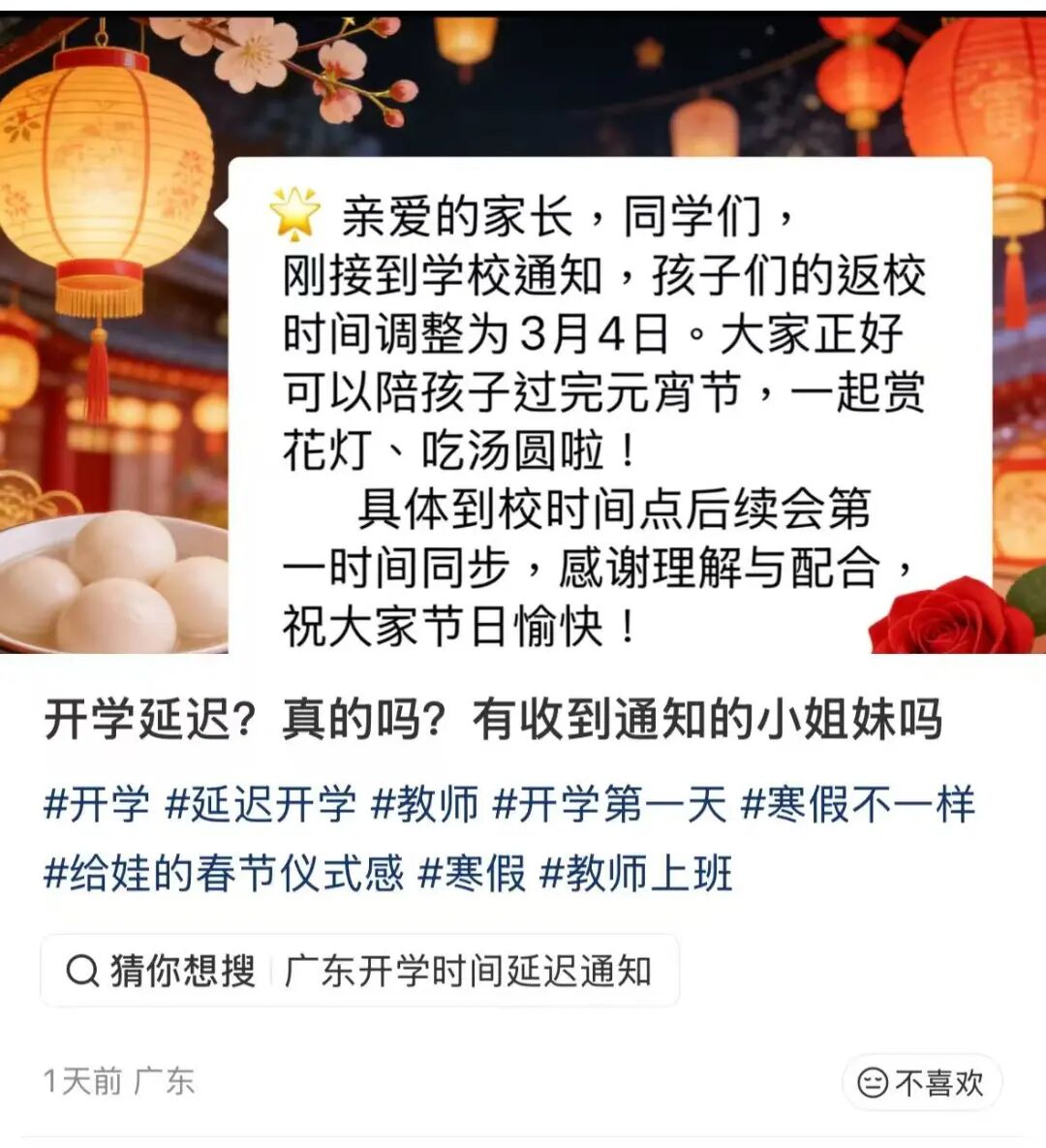 這里的延遲,主要是原定于元宵節(jié)前的開學(xué)推遲至節(jié)后開學(xué)。在相關(guān)帖子的評論區(qū),一大批節(jié)前開學(xué)的網(wǎng)友紛紛表示羨慕,希望自己的學(xué)校也能緊隨其上。