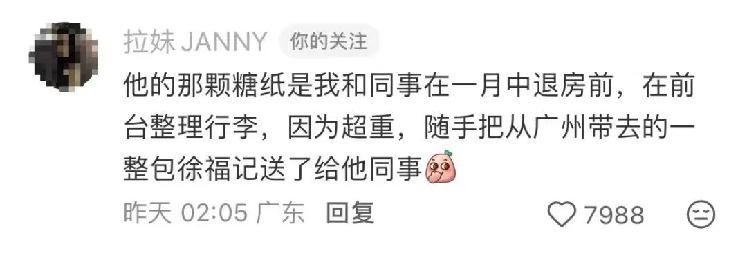 記者在原貼評論區發現網友@JANNY稱:這顆糖是今年1月中旬,她和同事退房時隨手把一整包從廣州帶去的徐福記酥心糖送給了酒店工作人員,機緣巧合被這位前臺小哥嘗到。“我只是那個‘播種’善意的人,這世界太奇妙了!”她對記者感嘆。