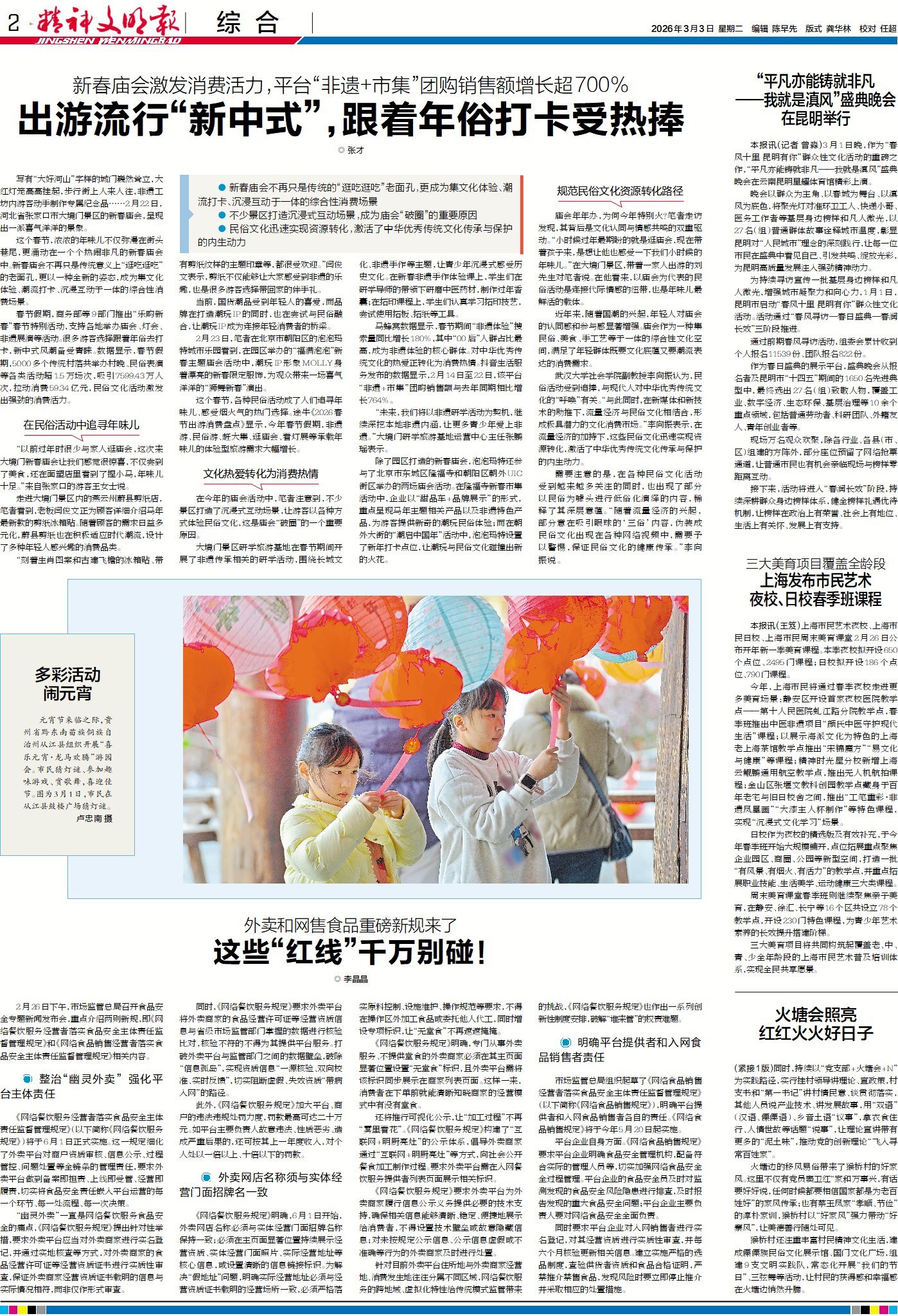 春節期間,新春廟會擺脫 “逛吃” 老面孔,升級為集文化體驗、潮流打卡、沉浸互動于一體的綜合性消費場景。春節假期,商務部等9部門推出 “樂購新春” 特別活動,支持各地舉辦廟會、燈會、非遺展演等活動,新中式風潮備受游客青睞。數據顯示,期間5000多個傳統村落共開展村晚、民俗表演等各類活動超1.5萬場次,吸引7599.43萬人次參與,拉動消費59.34億元,民俗文化活動釋放強勁消費活力。來今日2版看詳情。