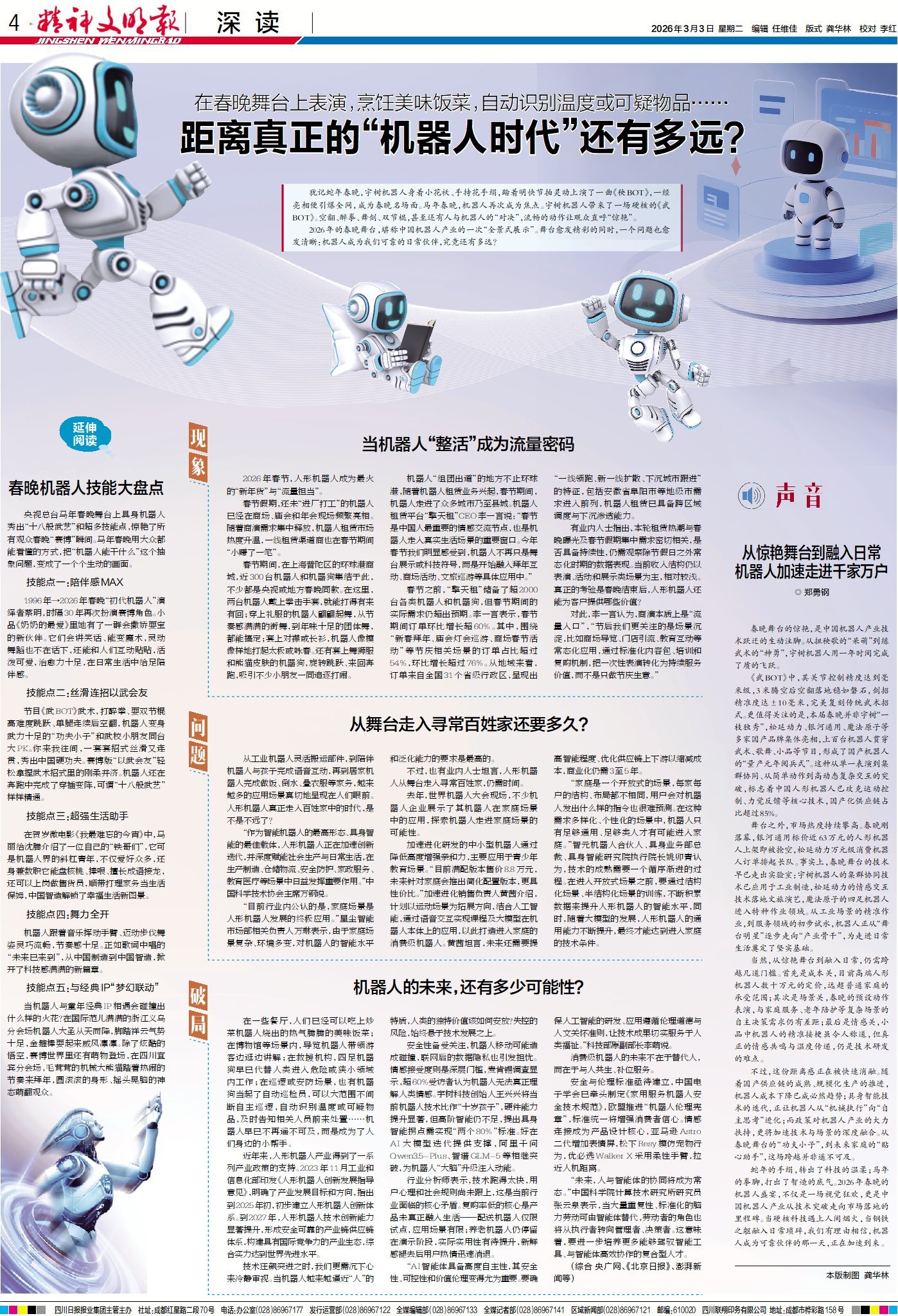 春晚舞臺上,機器人從扭秧歌到打武術,兩年間的“進化”驚艷了觀眾,也點燃了租賃市場的熱潮。但熱鬧背后,一個更現實的問題浮出水面:能跳舞的機器人,離成為我們家中那個會疊衣、做飯的“可靠伙伴”,究竟還有多遠?本期4版“深讀”為你探尋人形機器人的落地之路。