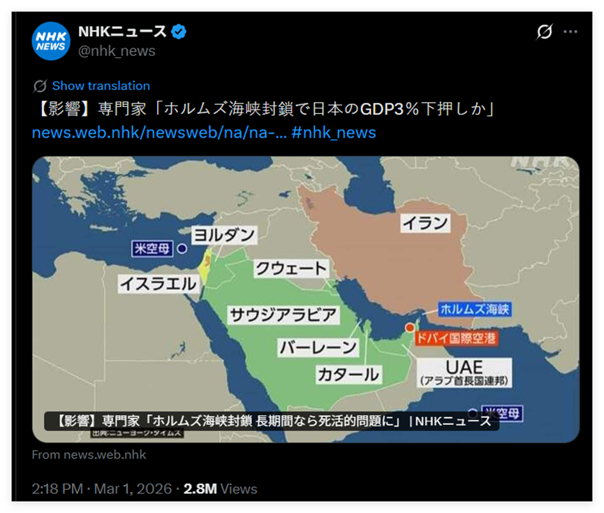 受美國和以色列對伊朗動武影響,國際能源價格正在飆升。這令能源極度依賴進口的日本相當(dāng)難受。