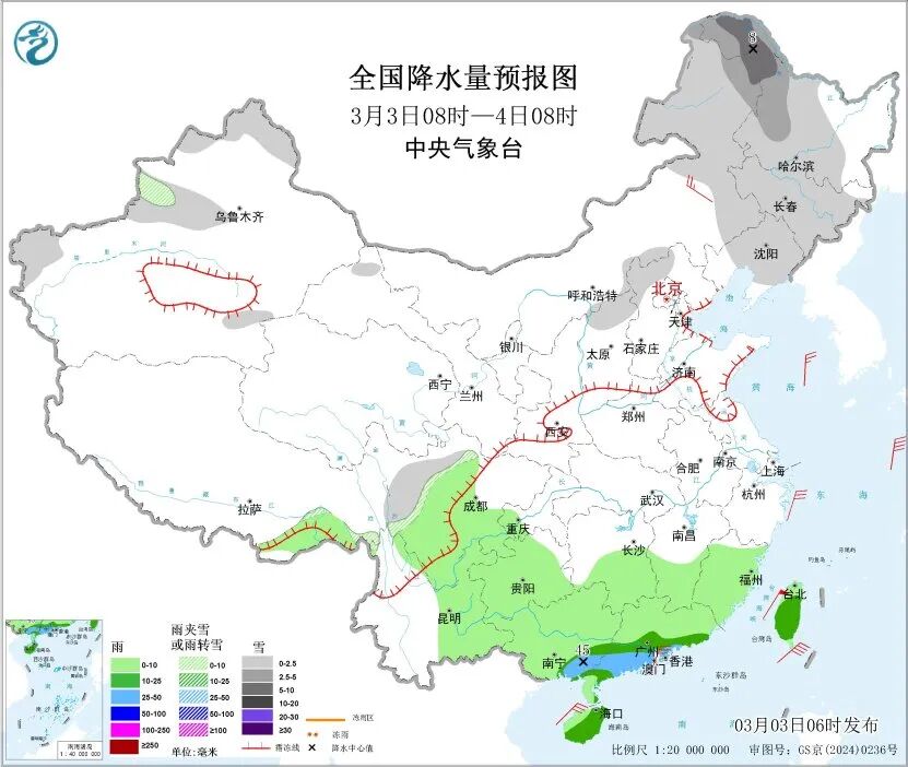 預計未來三天,內蒙古、東北地區、華北、新疆等地有雨雪,華南南部有明顯降雨。