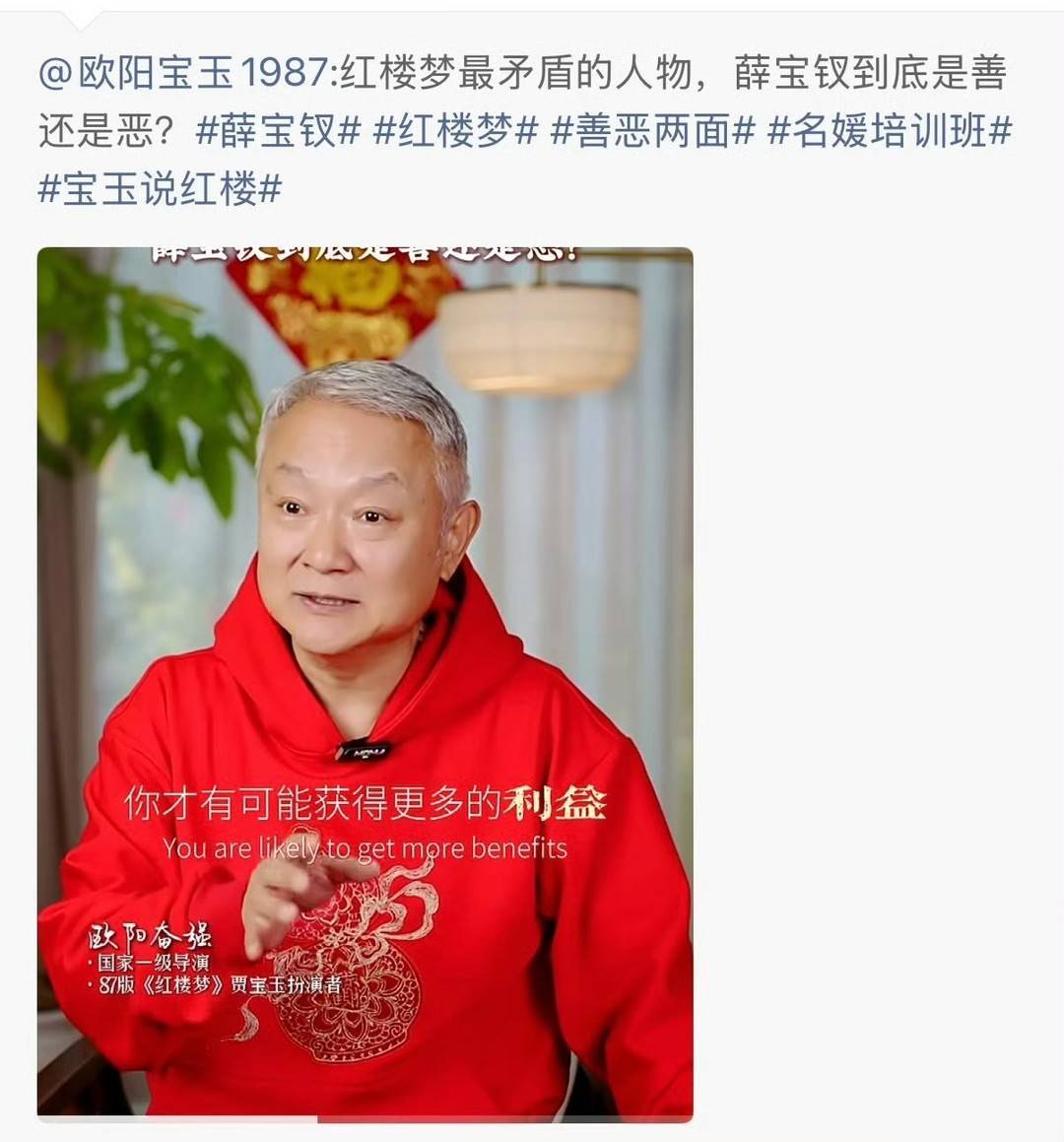 這場風波的起因,是賈寶玉扮演者歐陽奮強發布的一段視頻。他在視頻中直言薛寶釵是《紅樓夢》里“最矛盾的人物”,并用一個“裝”字概括其核心特質,將寶釵形容為“古代名媛培訓班”打造出的形象,認為其言行皆是利益驅動的功利表演,還呼吁現代女性學習林黛玉的“真性情”,摒棄薛寶釵的“偽裝術”。盡管歐陽奮強在視頻后半段以“人性復雜”試圖緩和觀點,承認寶釵“善是真的暖,惡是藏得無奈”,但其前期對寶釵的尖銳批判,仍引發廣泛爭論。