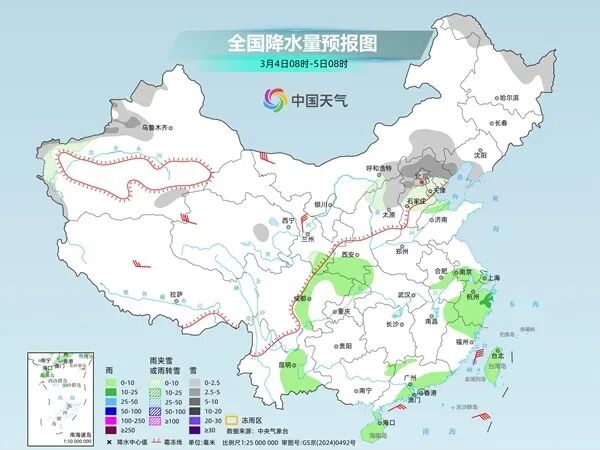 中央氣象臺預(yù)計,今天,內(nèi)蒙古東部、東北地區(qū)大部、華北北部、新疆北疆北部和伊犁河谷、川西高原西部等地部分地區(qū)有小雪或雨夾雪,內(nèi)蒙古東北部、黑龍江西北部等地部分地區(qū)有中到大雪;江南南部、華南及四川中南部、云南東部、貴州大部、海南島、臺灣島等地部分地區(qū)有小到中雨,廣西東南部、廣東中南部等地部分地區(qū)有大雨。