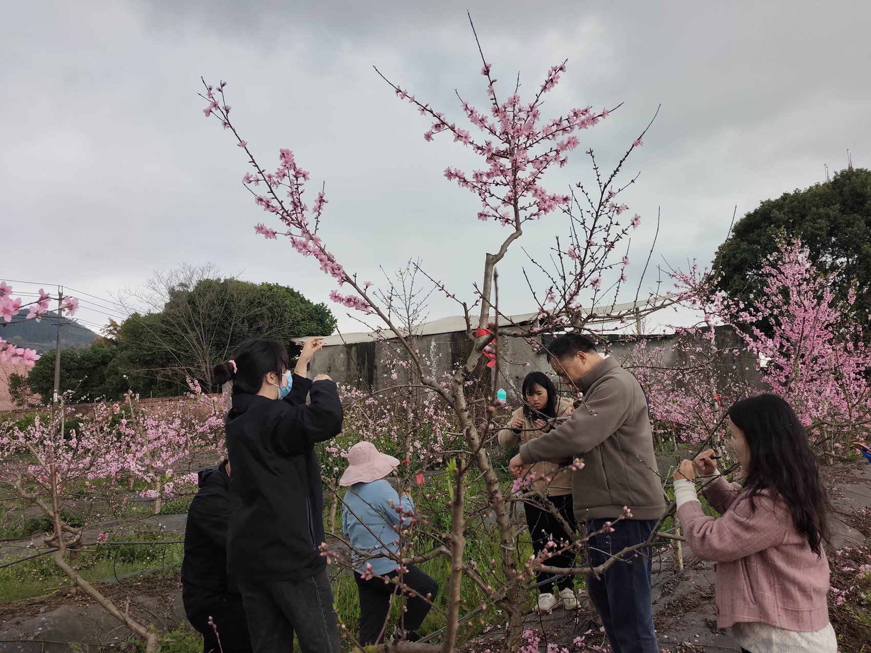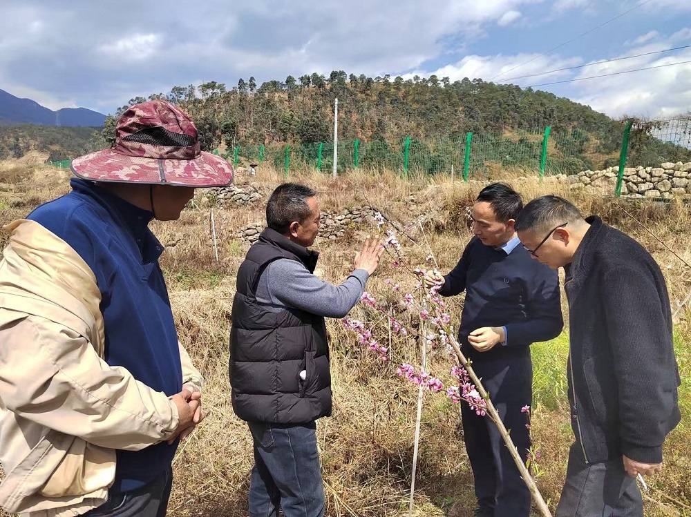 科研人員田間調查不同需冷量桃品種的枯花枯芽情況。 受訪者供圖