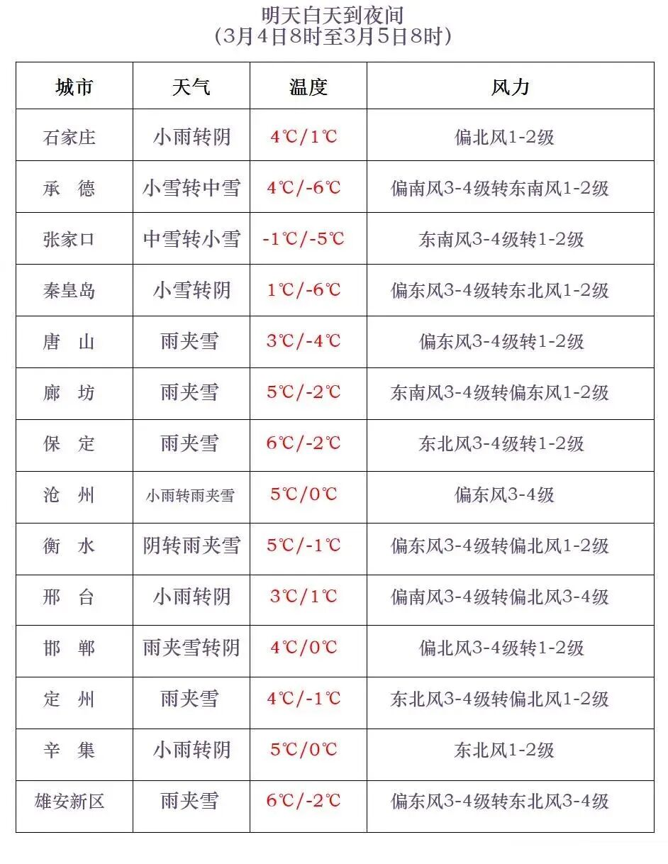 明天夜間到5日,保定、廊坊及以北地區(qū)陰有小雪轉(zhuǎn)多云,部分地區(qū)有中雪,局地有大雪,石家莊中南部、衡水南部、邢臺(tái)、邯鄲陰轉(zhuǎn)多云,其他地區(qū)陰有雨夾雪或小雪轉(zhuǎn)多云。