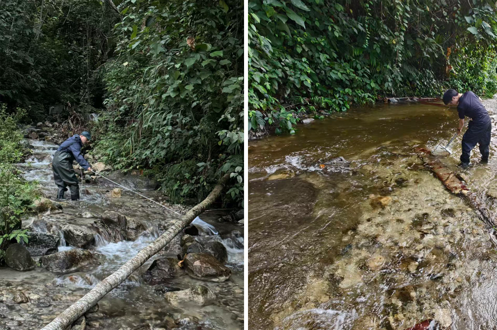 圖為墨脫流施密搖蚊棲息地環境照。上海海洋大學林曉龍副教授(左)和碩士研究生張智超(右)正在采集水生昆蟲。(西藏自治區高原生物研究所“達娃創新工作室”供圖)