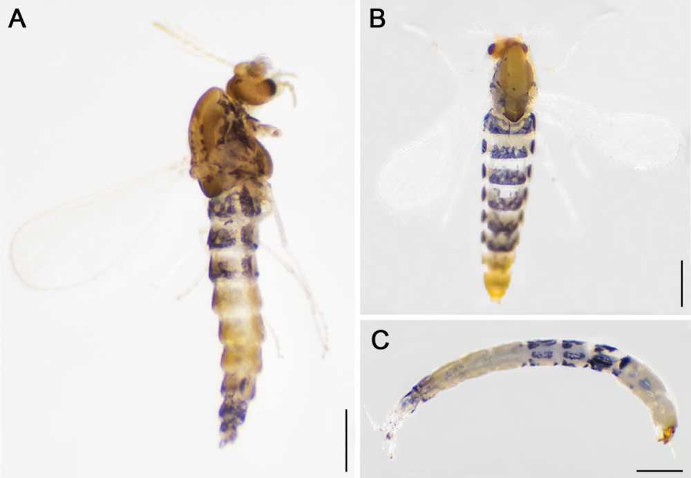 圖為墨脫流施密搖蚊整體照:A為雄成蟲、B為雌成蟲、C為幼蟲。(西藏自治區高原生物研究所“達娃創新工作室”供圖)