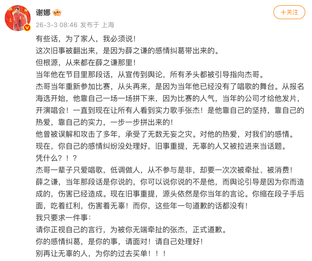 今早(3月3日),@謝娜 在微博發文喊話薛之謙稱:“這次舊事被翻出來,是因為薛之謙的感情糾葛帶出來的”,稱張杰當年重新參加比賽,從頭再來,是因為當年他已經沒有了唱歌的舞臺,“杰哥一輩子只愛唱歌,低調做人,從不參與是非,卻要一次次被牽扯、被消費”,并要求薛之謙向張杰道歉。