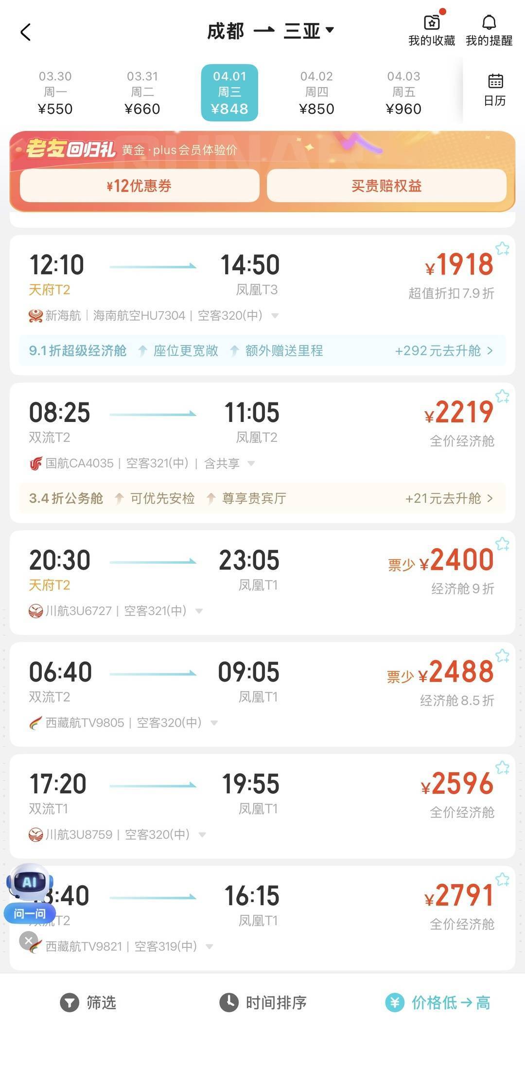 4月1日,成都飛三亞的部分機票價格(圖據網絡平臺)