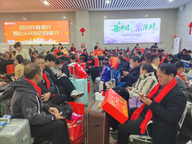 早上9點(diǎn)半,140名務(wù)工人員乘坐當(dāng)?shù)厝松绮块T(mén)提供的包車(chē)來(lái)到高鐵樂(lè)山站站前廣場(chǎng)集合。工作人員隨即將精心準(zhǔn)備的140份禮品送到務(wù)工人員手中。在簡(jiǎn)短而暖心的發(fā)車(chē)儀式結(jié)束后,務(wù)工人員跟隨工作人員腳步,在專屬通道有序通過(guò)安檢,來(lái)到專屬候車(chē)區(qū)休息。