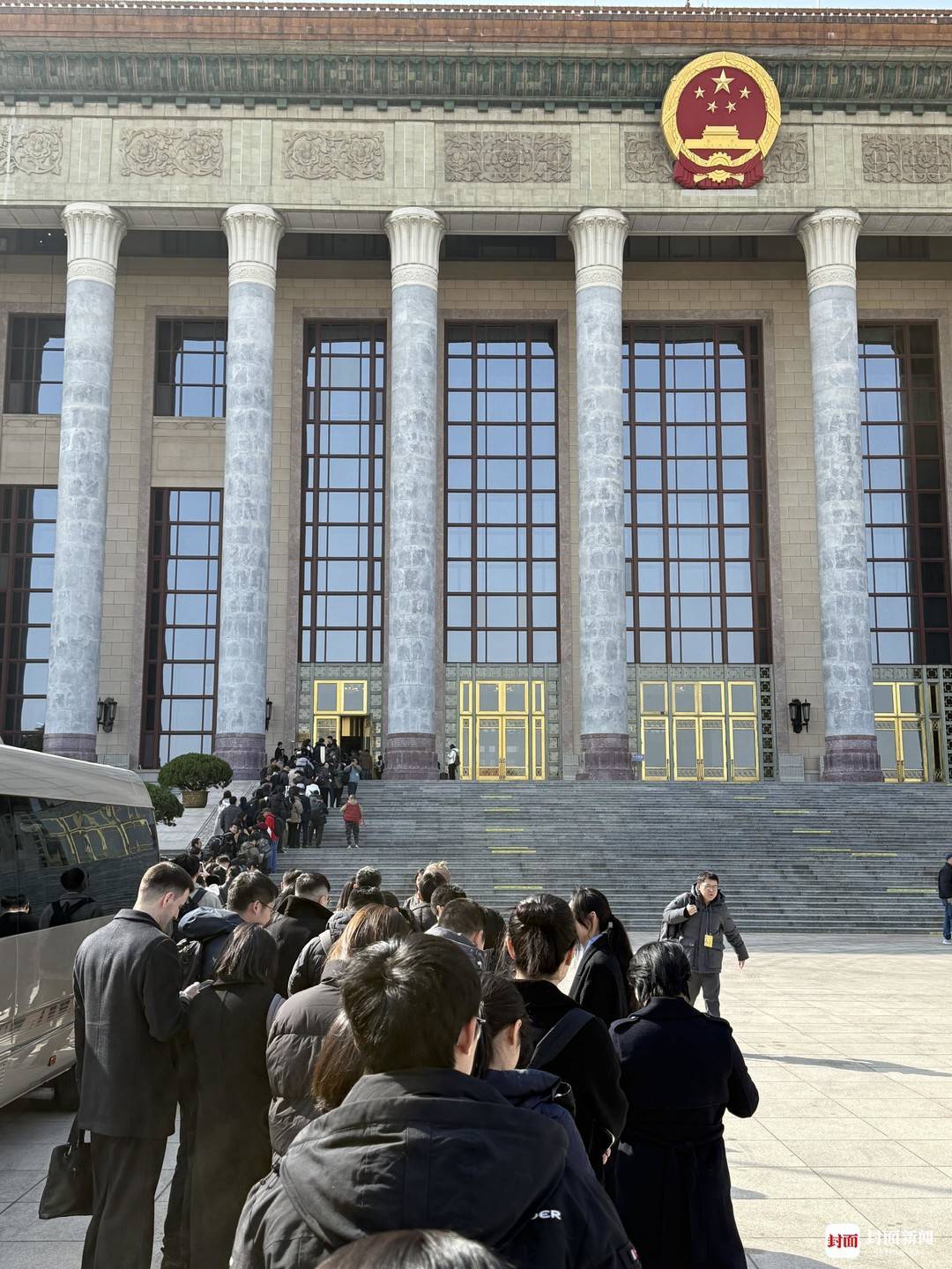 首場(chǎng)發(fā)布會(huì)前,記者在人民大會(huì)堂東門(mén)外排起長(zhǎng)隊(duì)。封面新聞代睿 攝影