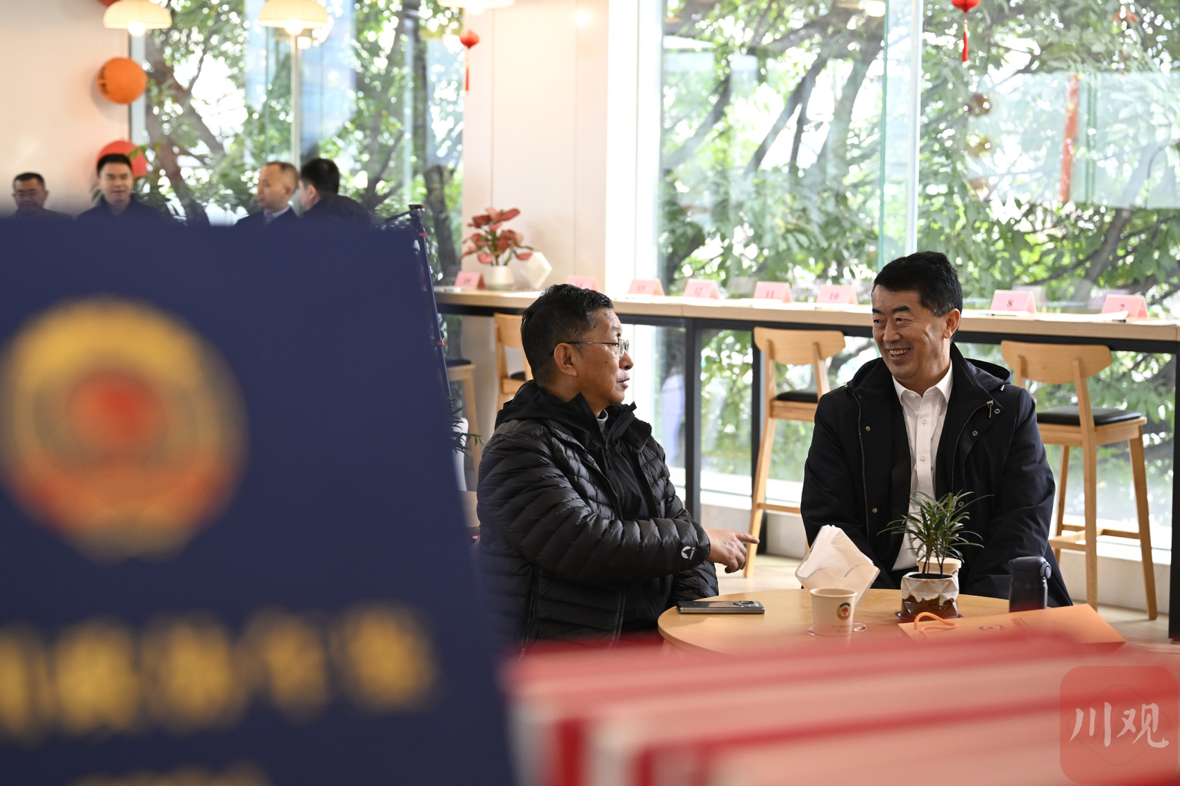 四川省全國(guó)政協(xié)委員阿來(左)、李為國(guó)就共同關(guān)注的領(lǐng)域展開交流。