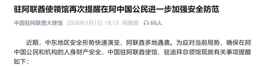 駐阿聯酋使領館再次提醒在阿中國公民進一步加強安全防范?近期,中東地區安全形勢快速演變,阿聯酋多地遇襲。為應對當前局勢,確保在阿中國公民和機構的人身財產安全,中國駐阿聯酋使館、駐迪拜總領館現就有關事項作出提醒。(詳情請戳↓↓↓)