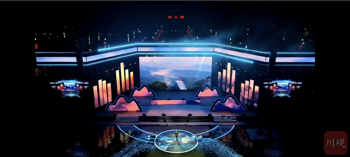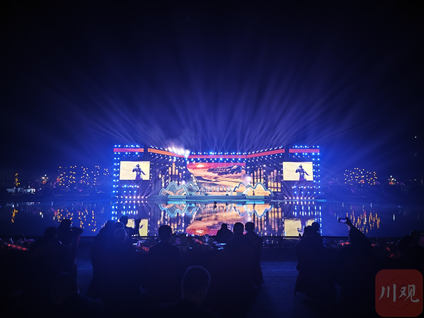 今年晚會的最大亮點在于舞臺的創新設計。興文縣新春元宵晚會總導演馬遠介紹,團隊在寬闊湖面上搭建起大型水舞臺,與30米外的觀眾席遙相呼應,巧妙呈現出“一海兩山”(興文石海、僰王山、仙峰山)的虛實意境。波光粼粼的湖面倒映著璀璨燈火與舞美光影,人景相融,如夢似幻。