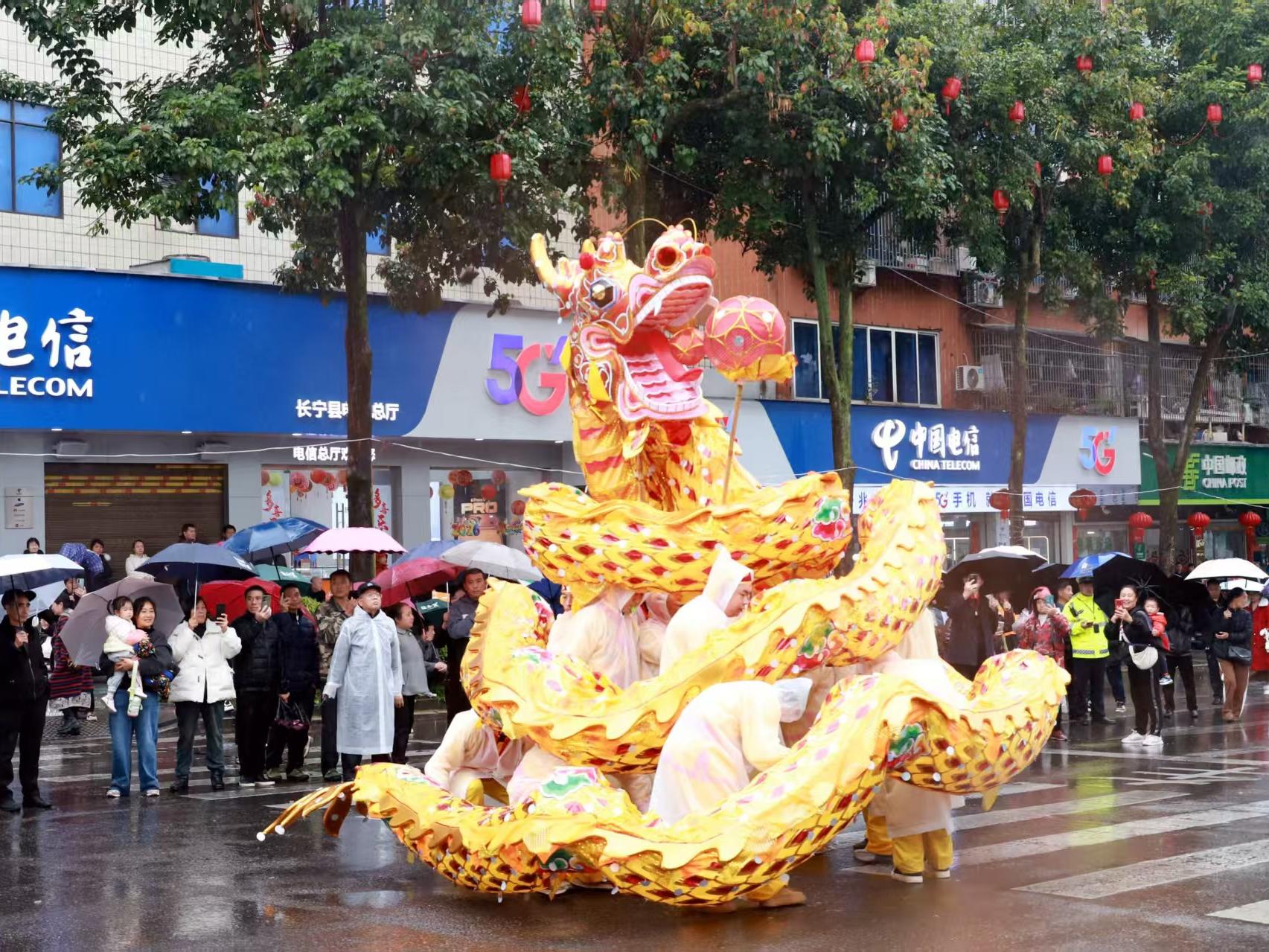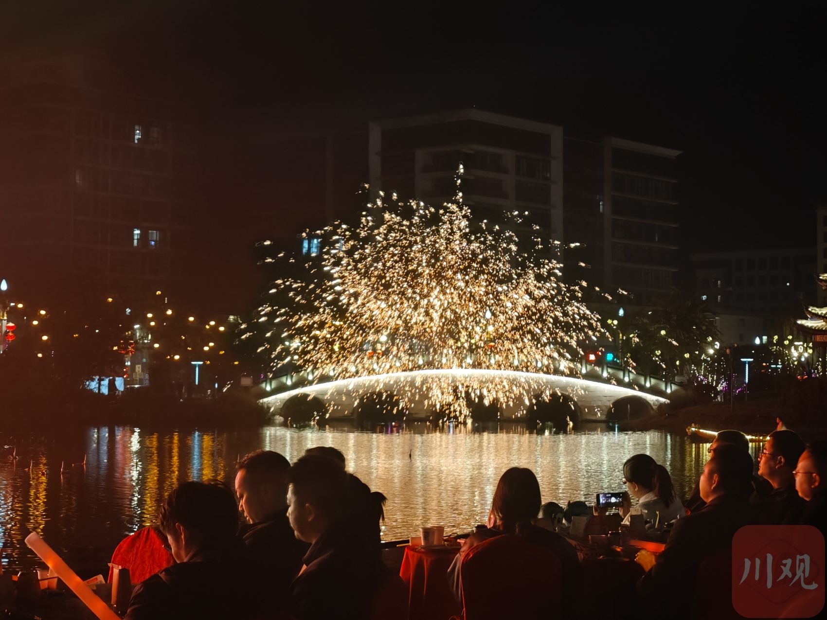 當晚19時30分,大型情景舞蹈《歡天喜地鬧元宵》拉開序幕。舞龍舞獅翻騰跳躍,魚燈滾燈流光溢彩,國家級非遺項目大壩高裝驚艷亮相,打鐵花如流星雨灑落湖面,瞬間點燃全場熱情。噴泉、燈光、煙花、打鐵花等元素穿插其中,驚喜連連。