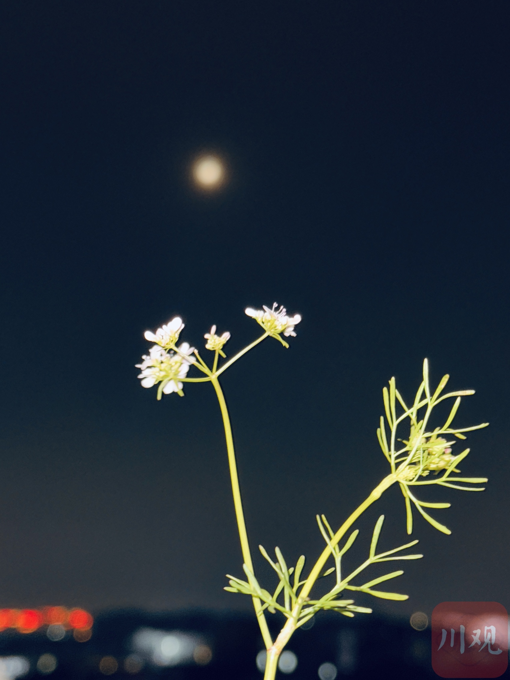 成都雙流區(qū)黃甲街道,一株白色小花在夜色中舒展,背景是朦朧的紅月。C視覺簽約攝影師 龔榜玉
