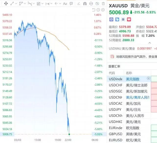 財聯社3月3日電,現貨金價、銀價延續跌勢,現貨黃金跌6.09%,報4997.73美元/盎司;現貨白銀跌10.63%,報79.82美元/盎司。