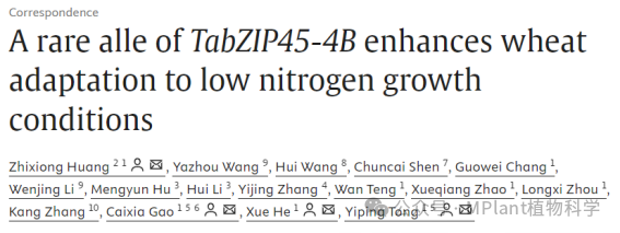 2026年2月26日,中國科學院遺傳與發育生物學研究所童依平組和中偉達(杭州)生物科技產業發展有限公司(PROVIDIA)聯合在Plant Communications?發表題為A rare alle of TabZIP45-4B enhances wheat adaptation to low nitrogen growth conditions?的研究論文。該研究揭示了一個稀有等位基因TabZIP45-4B通過調控TaDWARF4基因表達,顯著提升小麥在低氮條件下的穗數和產量,為培育氮高效小麥品種提供了重要基因資源和分子機制。