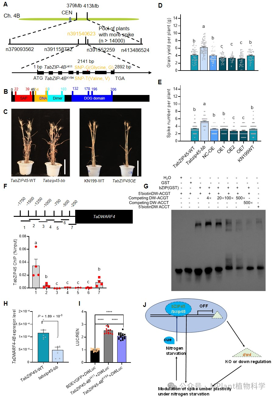為驗證該基因功能,研究團隊利用CRISPR-Cas9技術構建了Tabzip45-bb敲除突變體,并在KN199背景中構建過表達(OE)系。在低氮(30 kg N/ha)條件下,敲除突變體的穗數和單株產量顯著增加,而過表達系則顯著下降,千粒重無顯著變化(圖1C-E)。這表明TabZIP45-4B是低氮條件下穗數和產量的負調控因子。