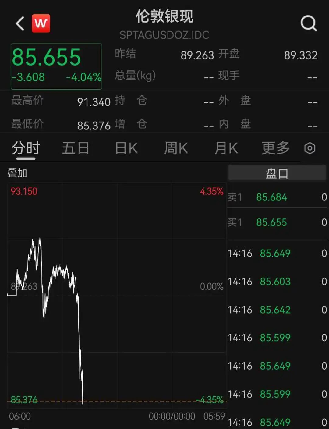 現(xiàn)貨白銀日內(nèi)跌幅擴大至達4%,現(xiàn)報85.655美元/盎司。