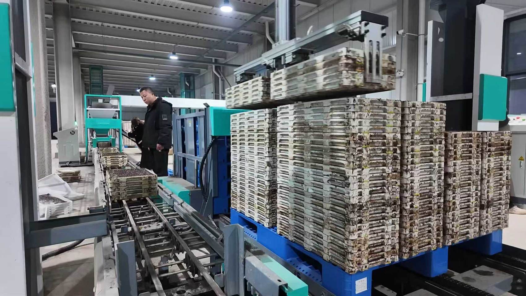 去年,洪雅縣首次采用工廠化育秧,洪雅止戈稻田現代化農業有限責任公司租賃了止戈鎮農事綜合服務中心的設施進行運營。該公司負責人張雪勤介紹,他們采用自動流水線暗化兩段育秧,做了80畝秧田。高速育秧流水線1小時可播種2000個秧盤,比人工快15倍;之后室內暗化28—30小時,可使稻種均勻出芽;最后用叉車把秧盤運送到室外的運秧航車上,一次性擺放150個秧盤,能快速高效地將秧盤運送到田間育秧,25—30天后即可交付給種植戶。