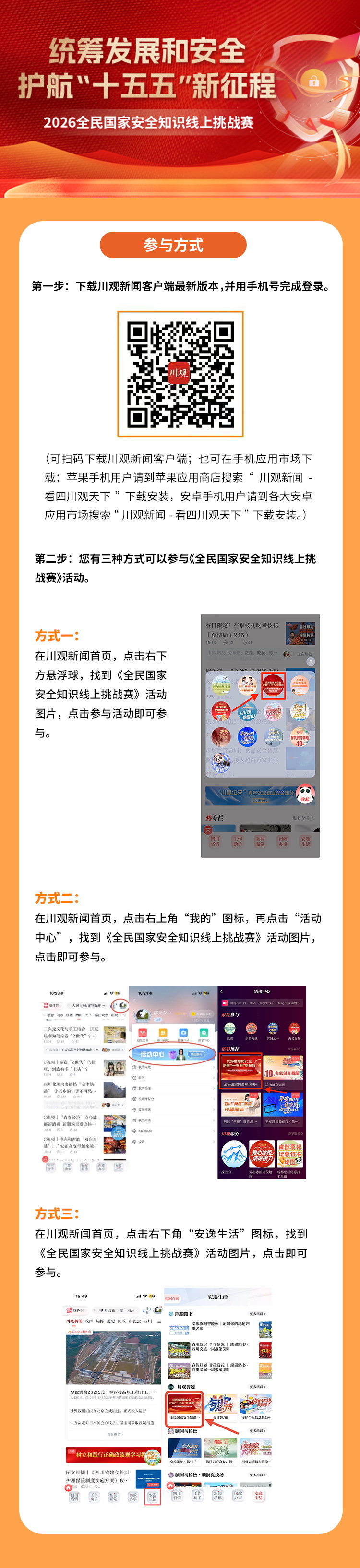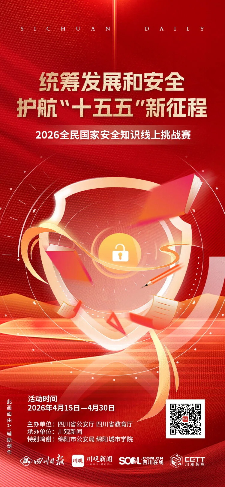 2026年4月15日是第十一個全民國家安全教育日,今年的活動主題為“統籌發展和安全 護航‘十五五’新征程”。為增強全民國家安全意識和法治素養,由川觀新聞聯合省公安廳、省教育廳開展的“統籌發展和安全 護航‘十五五’新征程”全民國家安全知識線上挑戰賽正式啟動。