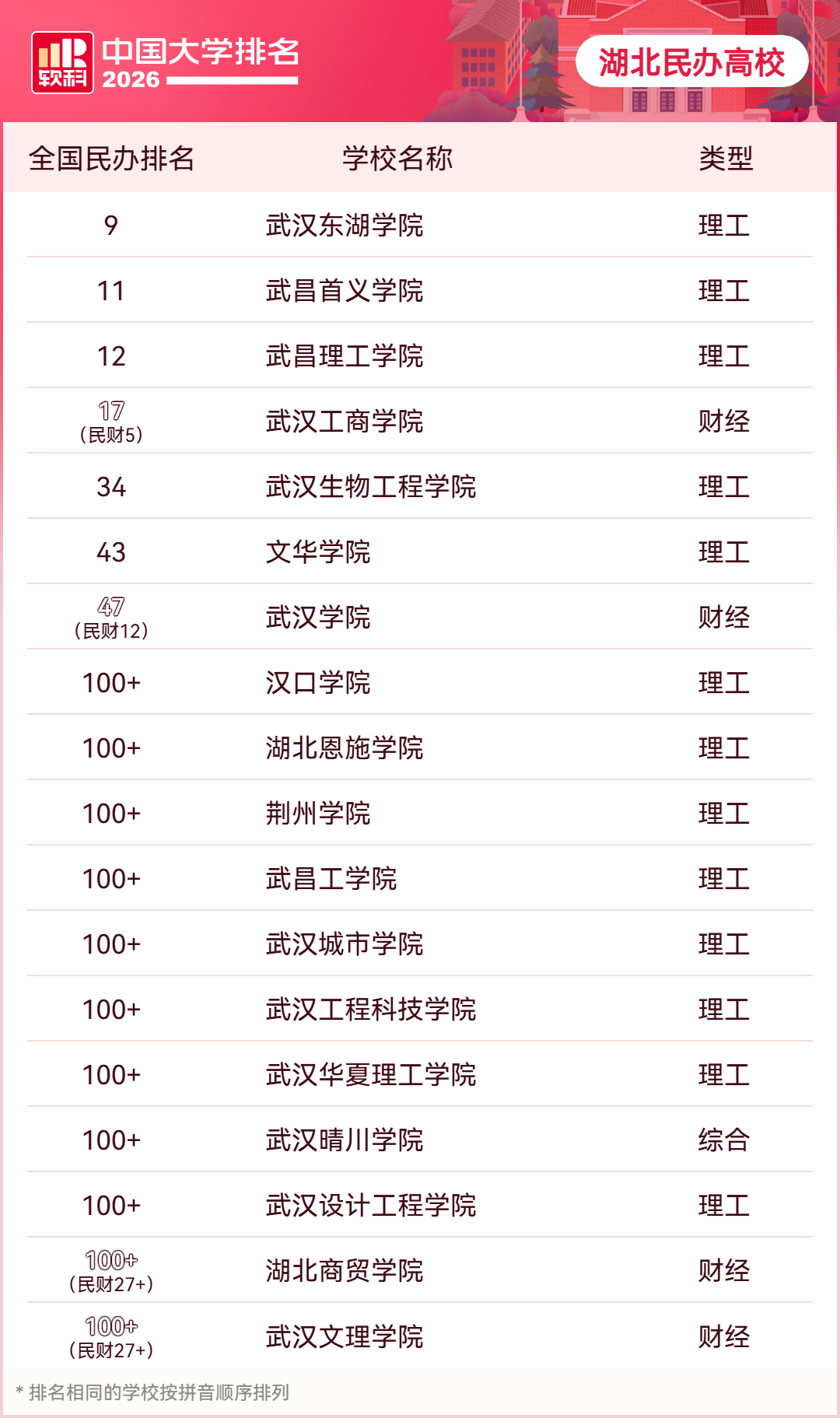 民辦高校方面,湖北5所高校進入民辦主榜前100名:武漢東湖學院(第9名)、武昌首義學院(第11名)、武昌理工學院(第12名)、武漢生物工程學院(第34名)、文華學院(第43名)。在民辦財經類排名中,武漢工商學院位列第5名,武漢學院位列第12名。