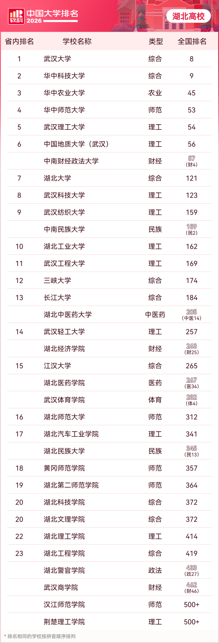 4月15日,高等教育專業評價機構軟科發布“2026軟科中國大學排名”,湖北高校表現亮眼,共有52所高校上榜,其中公辦高校34所,民辦高校18所。