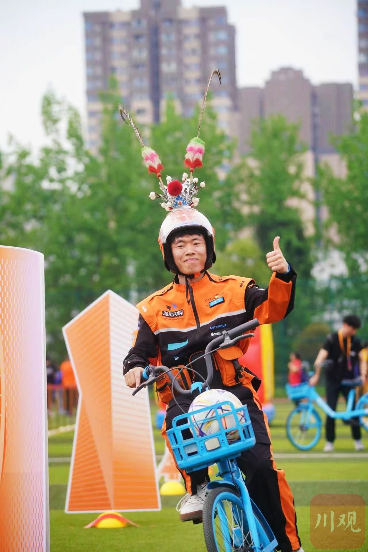 頭戴創意頭盔的外賣小哥在騎行繞樁項目中完成挑戰。