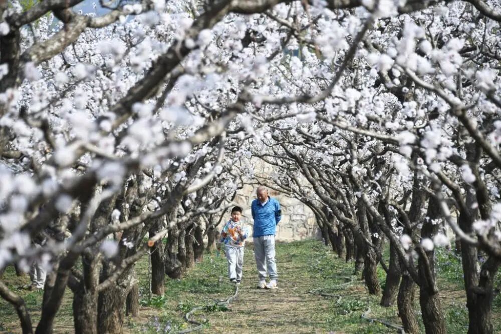 市民在北京市平谷區南獨樂河鎮北寨村觀賞杏花。新華社記者任超攝
