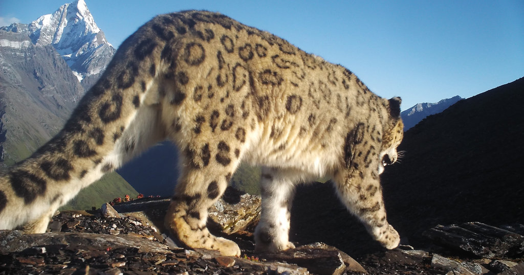安置的紅外相機在四姑娘山拍攝到的幺妹峰與雪豹同框畫面。四姑娘山風景名勝區(qū)管理局供圖