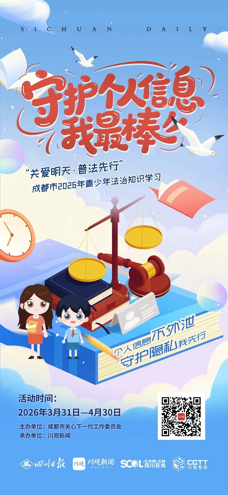 重要通知!由成都市關心下一代工作委員會主辦、川觀新聞承辦的“守護個人信息我最棒——‘關愛明天·普法先行’成都市2026年青少年法治知識學習”活動正式進入第二階段——知識競答。等你來挑戰!