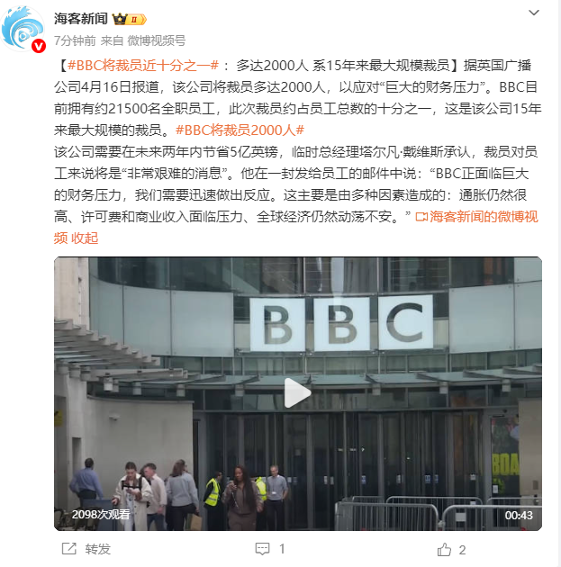 據(jù)英國廣播公司4月16日報(bào)道,該公司將裁員多達(dá)2000人,以應(yīng)對“巨大的財(cái)務(wù)壓力”。