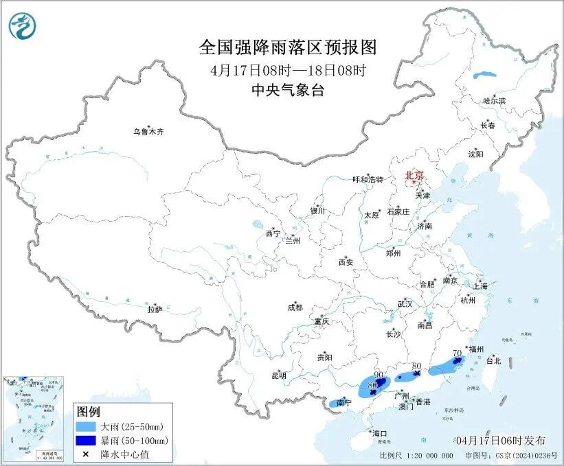 預計,4月17日08時至18日08時,廣西東部和南部、廣東中北部、福建東南部等地部分地區有大雨,其中,廣西東部、廣東北部、福建東南部等地部分地區有暴雨(50~90毫米)。上述部分地區伴有短時強降水(最大小時降雨量20~40毫米,局地可超過50毫米),局地有雷暴大風或冰雹等強對流天氣。