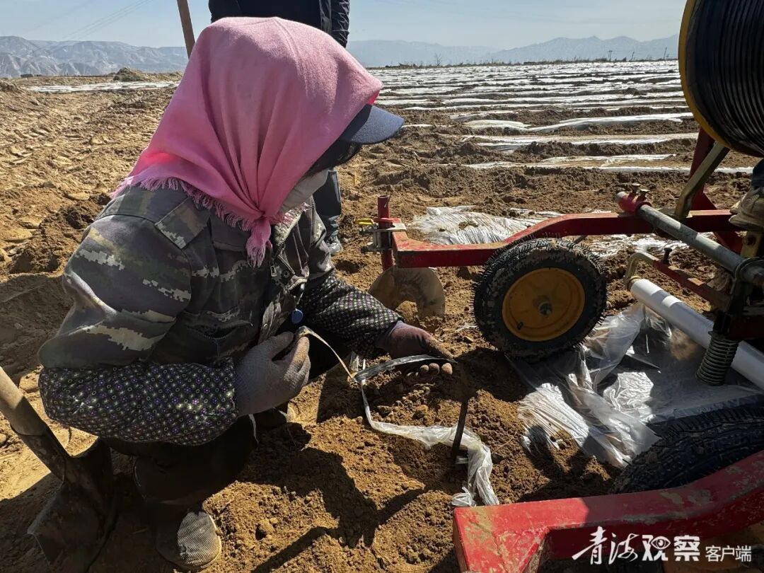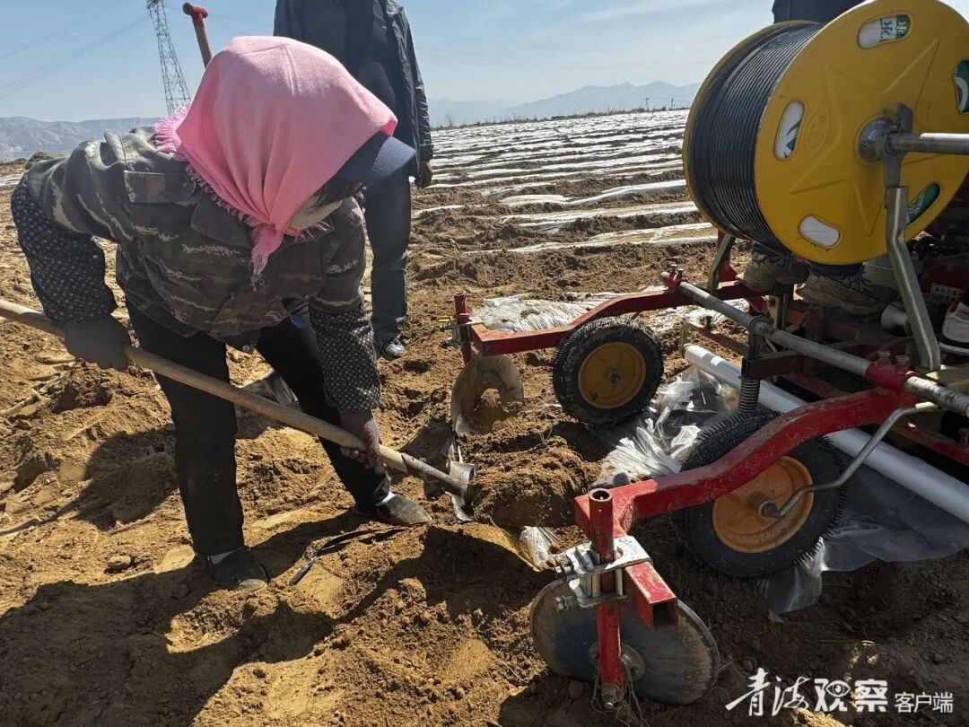 地頭上,李善俊蹲下身,在播種機試鋪的一小段地膜邊緣扒開泥土,用指尖探入,確認滴灌設備的埋設深度,確保無誤后再正式開工。