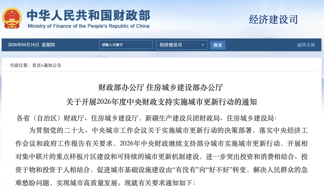 《通知》提出,2026年中央財(cái)政繼續(xù)支持部分城市實(shí)施城市更新行動(dòng),開展相對集中聯(lián)片的重點(diǎn)樣板片區(qū)建設(shè)和可持續(xù)的城市更新機(jī)制建設(shè),進(jìn)一步突出投資和消費(fèi)相結(jié)合、投資于物和投資于人相結(jié)合,促進(jìn)城市基礎(chǔ)設(shè)施建設(shè)由“有沒有”向“好不好”轉(zhuǎn)變,解決人民群眾的急難愁盼問題,實(shí)現(xiàn)城市高質(zhì)量發(fā)展。