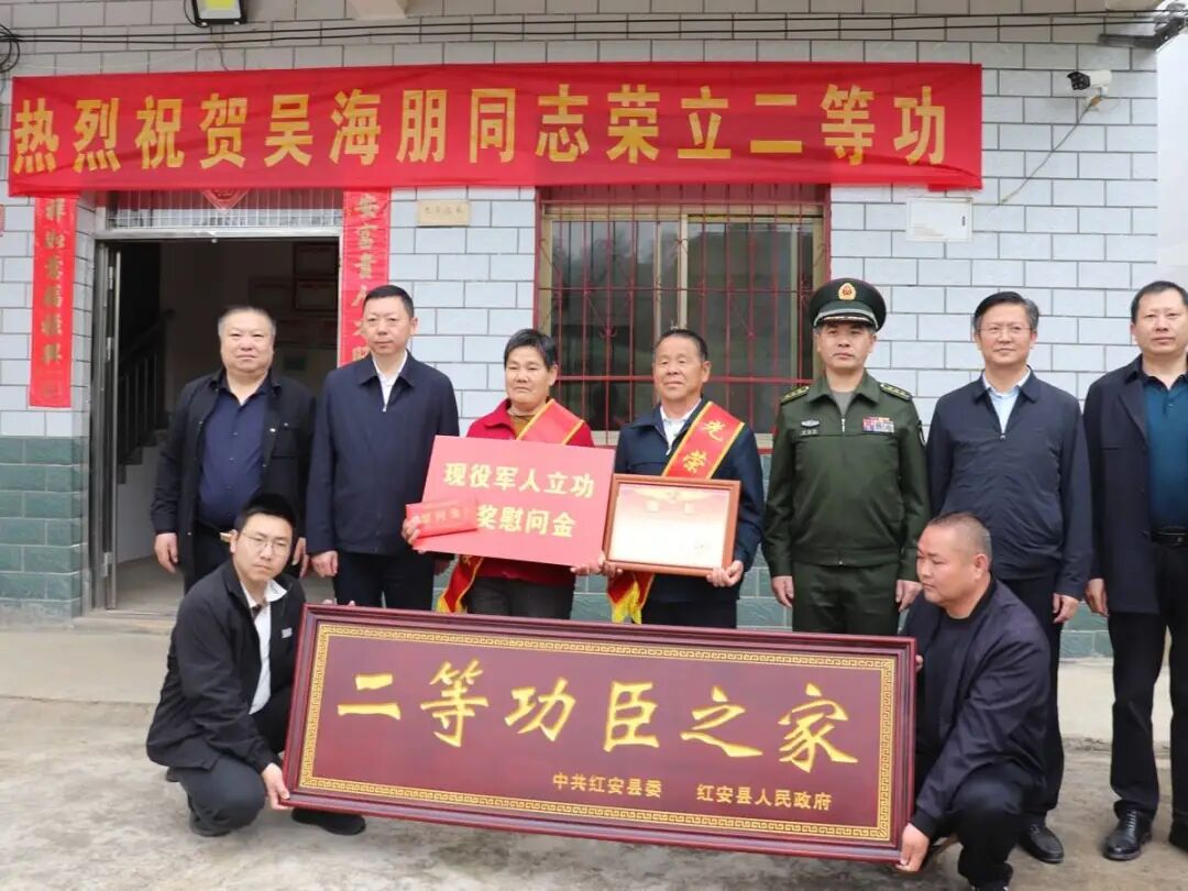 4月15日上午,黃岡紅安縣軍地聯合組成送喜報隊伍,來到該縣城關鎮上店社區,為榮立二等功的現役軍人吳海朋家庭送去立功喜報、“二等功臣之家”牌匾與慰問獎勵。