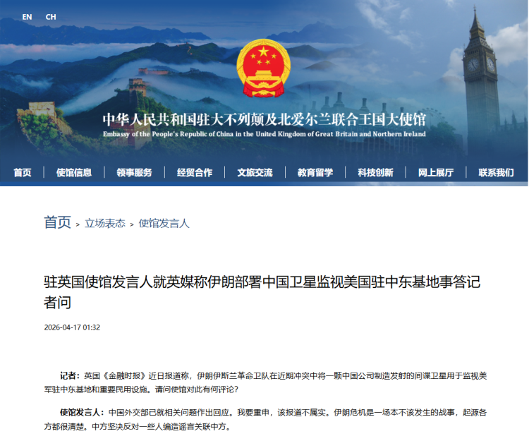 17日,駐英國使館發言人就英媒稱伊朗部署中國衛星監視美國駐中東基地事答記者問。