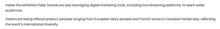文章注意到,本屆消博會(huì)有來(lái)自60多個(gè)國(guó)家和地區(qū)的超過(guò)3400個(gè)品牌參展,參展國(guó)際展品占比65%,較去年提升20個(gè)百分點(diǎn)。在展館內(nèi),各品牌還借助直播平臺(tái)等數(shù)字營(yíng)銷工具來(lái)觸達(dá)更廣泛的受眾群體。參觀者可以品嘗到從歐洲乳制品、法國(guó)葡萄酒到加拿大草本茶等各種產(chǎn)品樣品,這充分體現(xiàn)了展會(huì)的國(guó)際多樣性。